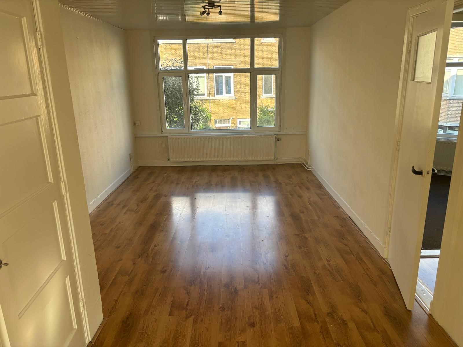De grote open woonkamer heeft een prettige licht inval en een open moderne keuken aan de achterzijde. Vanuit de achterkamer tevens toegang middels openslaande deuren naar het zonnige balkon.
