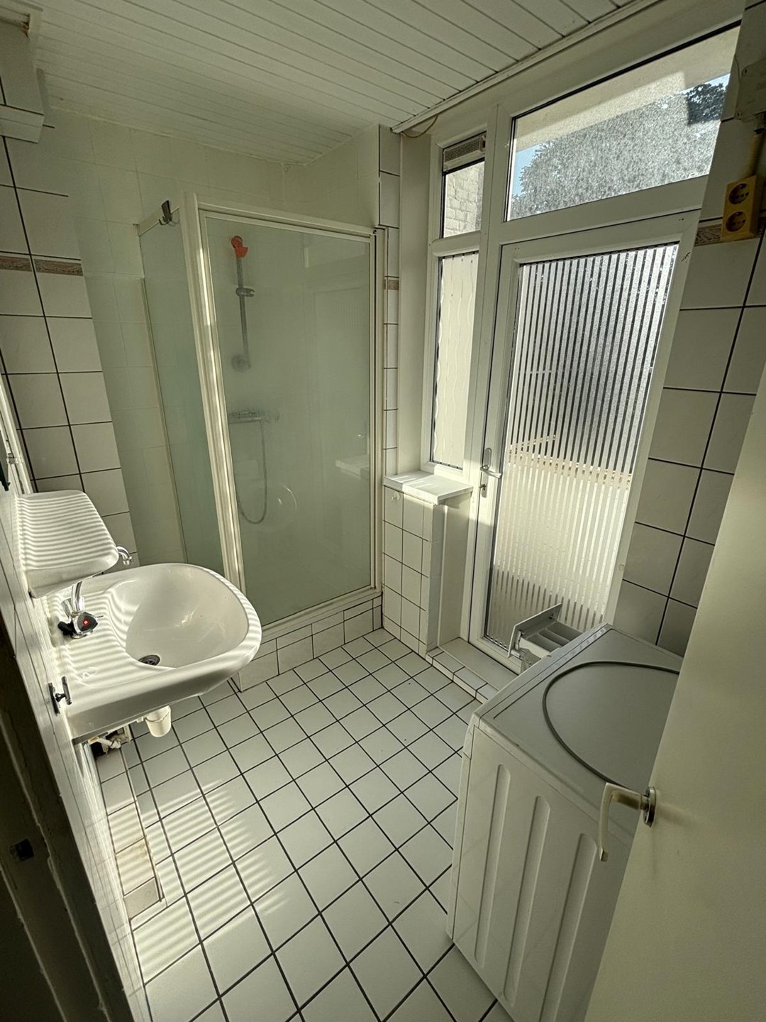 Vanuit de hal een apart toilet, en apart een ruime badkamer. Hier is een douche aanwezig evenals een wastafel en aansluiting voor de wasmachine. Er is ook een deur naar het achter balkon.