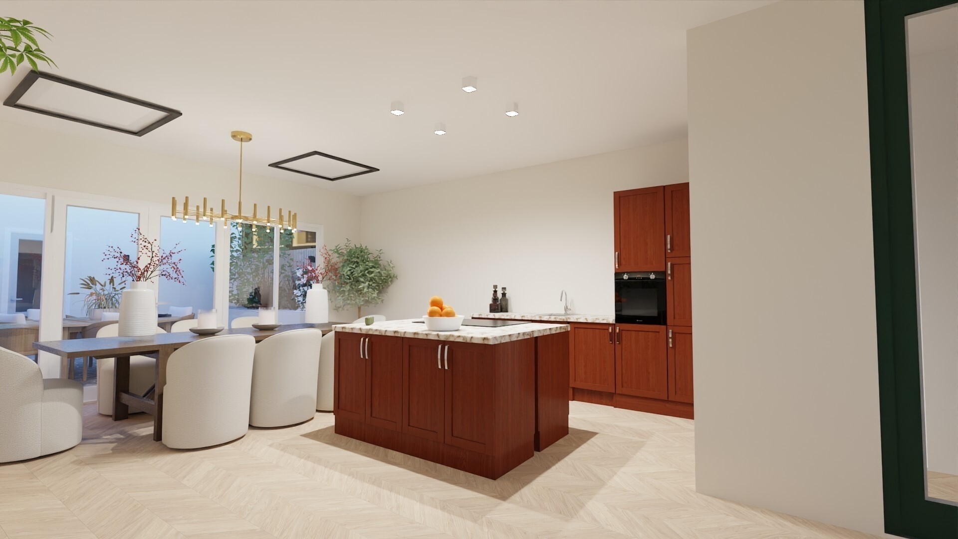 - Prachtige keuken walnoot met trend travertin aanrechtblad en A apparatuur waaronder Quooker.