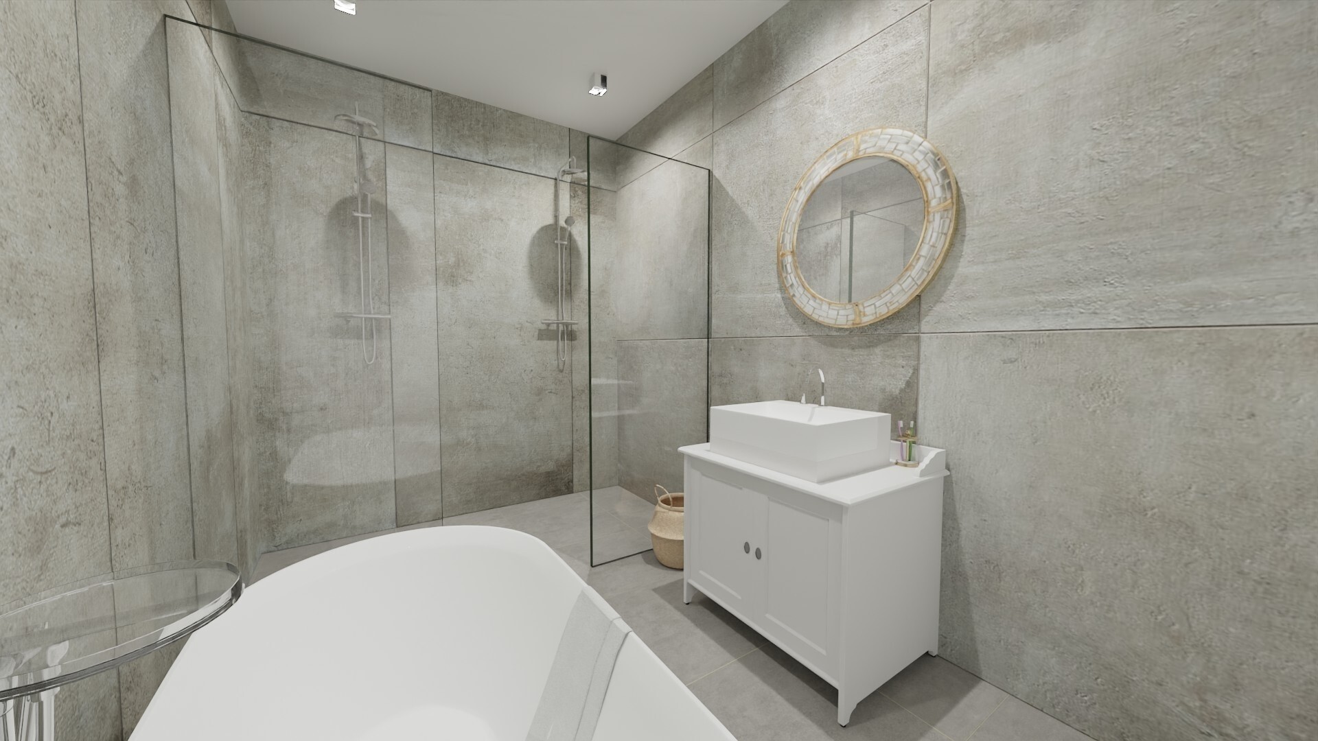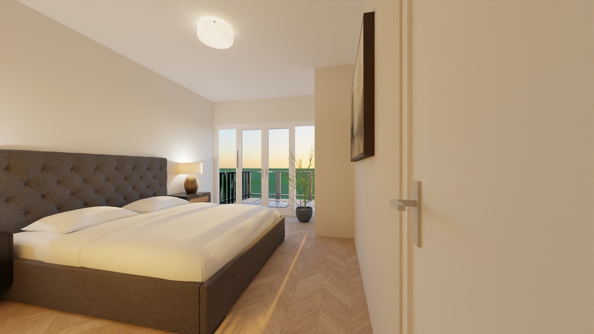 Eerste verdieping drie ruime slaapkamers, waarvan twee kamers aan de achterzijde toegang hebben tot het ruime achterbalkon. Ook deze verdieping heeft PVC vloeren met vloerverwaming. De badkamer en apart toilet zijn betegeld in grijs tinten. De badkamer heeft een ligbad en grote inloop douche. Uiteraard wordt er voor een wastafel met meubel gezorgd.