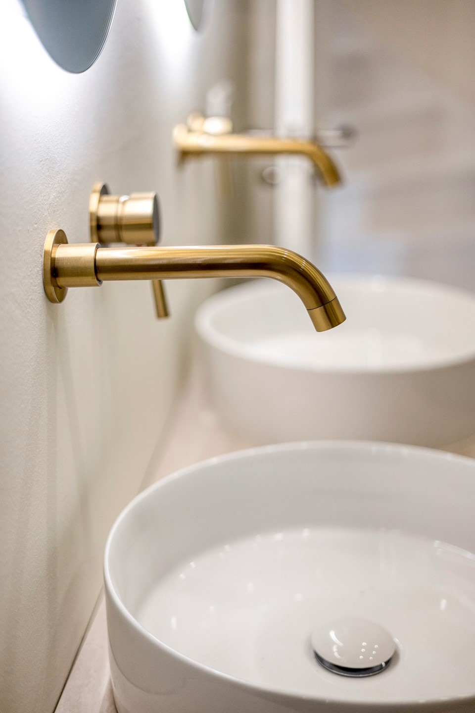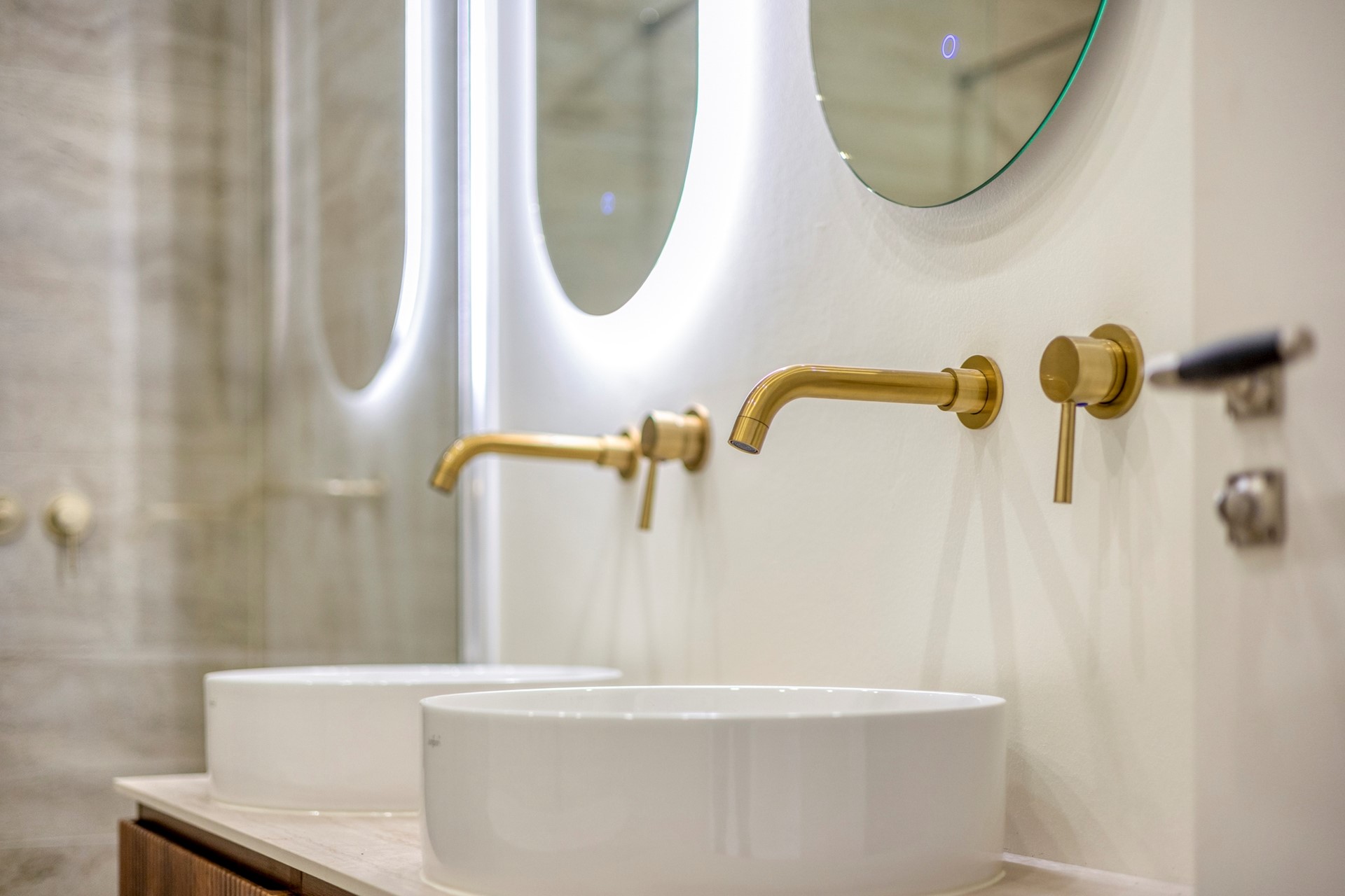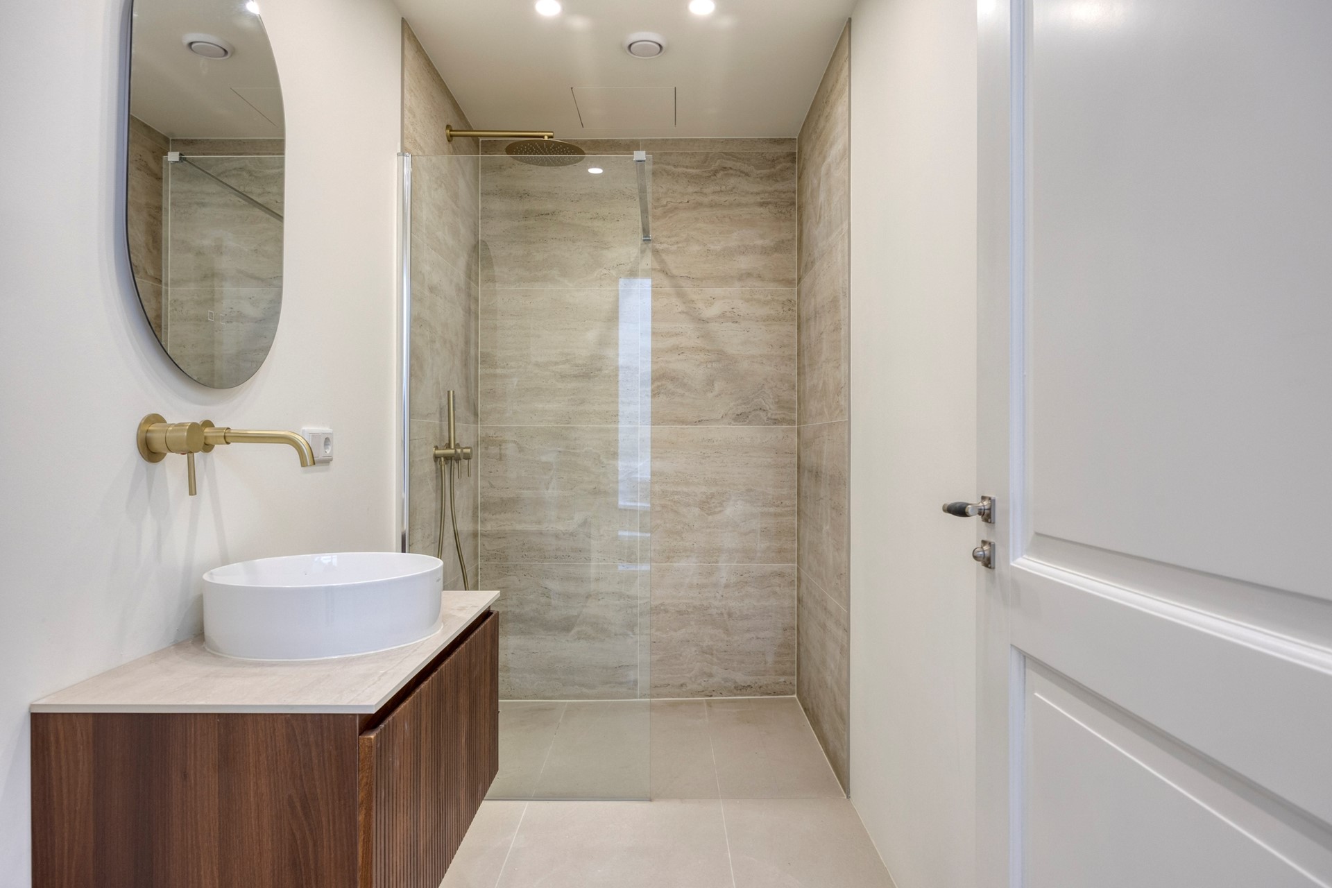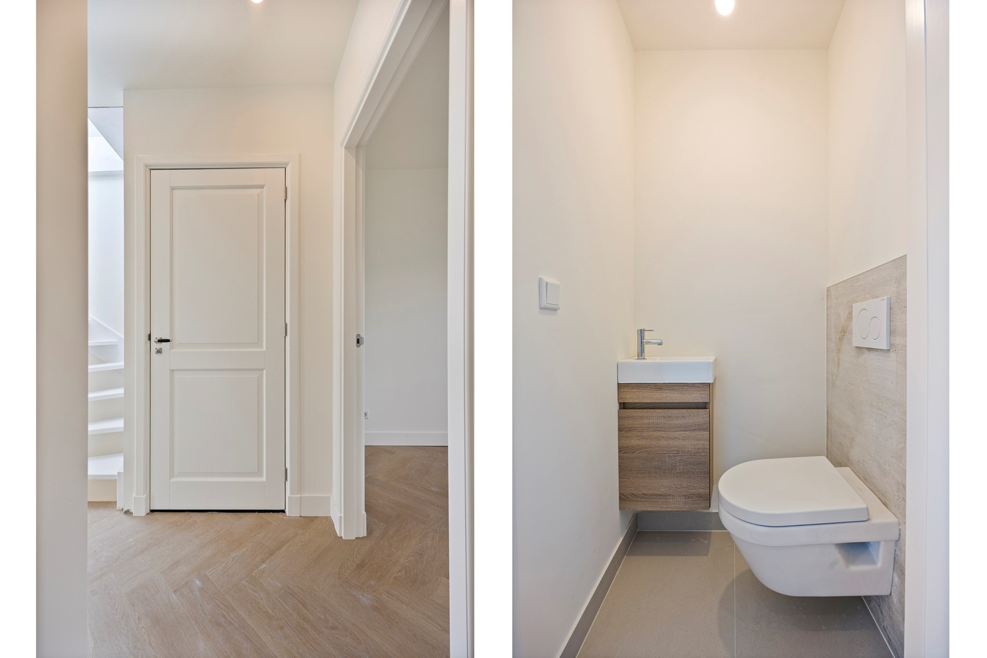 Eerste verdieping drie ruime slaapkamers, waarvan twee kamers aan de achterzijde toegang hebben tot het ruime achterbalkon. Ook deze verdieping heeft PVC vloeren met vloerverwaming. De badkamer en apart toilet zijn betegeld in grijs tinten. De badkamer heeft een ligbad en grote inloop douche. Uiteraard wordt er voor een wastafel met meubel gezorgd.