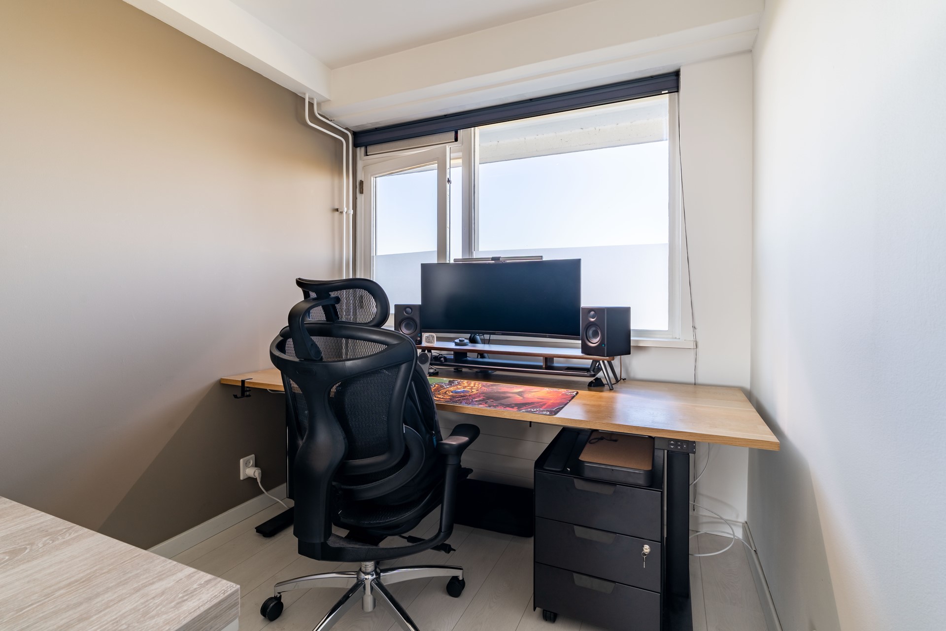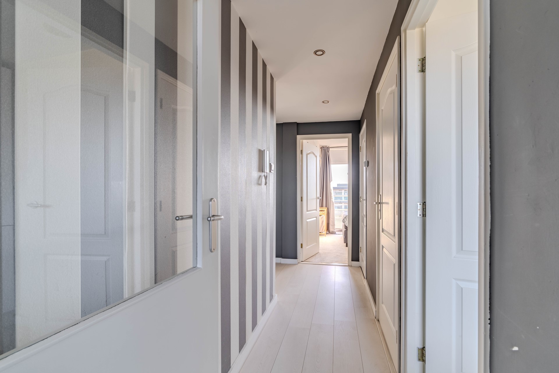 De grote slaapkamer heeft een toegangsdeur naar het ruime zonnige balkon op het Zuid Oosten. De tweede slaapkamer is naast de eetkamer aan de galerij gelegen, ideaal als gastenkamer of thuiswerkkamer. Nette keuken, uitgevoerd in rustige wit- en houttinten, met voldoende werk- en bergruimte en voorzien van kookplaat en afzuiging, koel vriescombinatie, afwasmachine en opstelplaats voor de wasmachine.