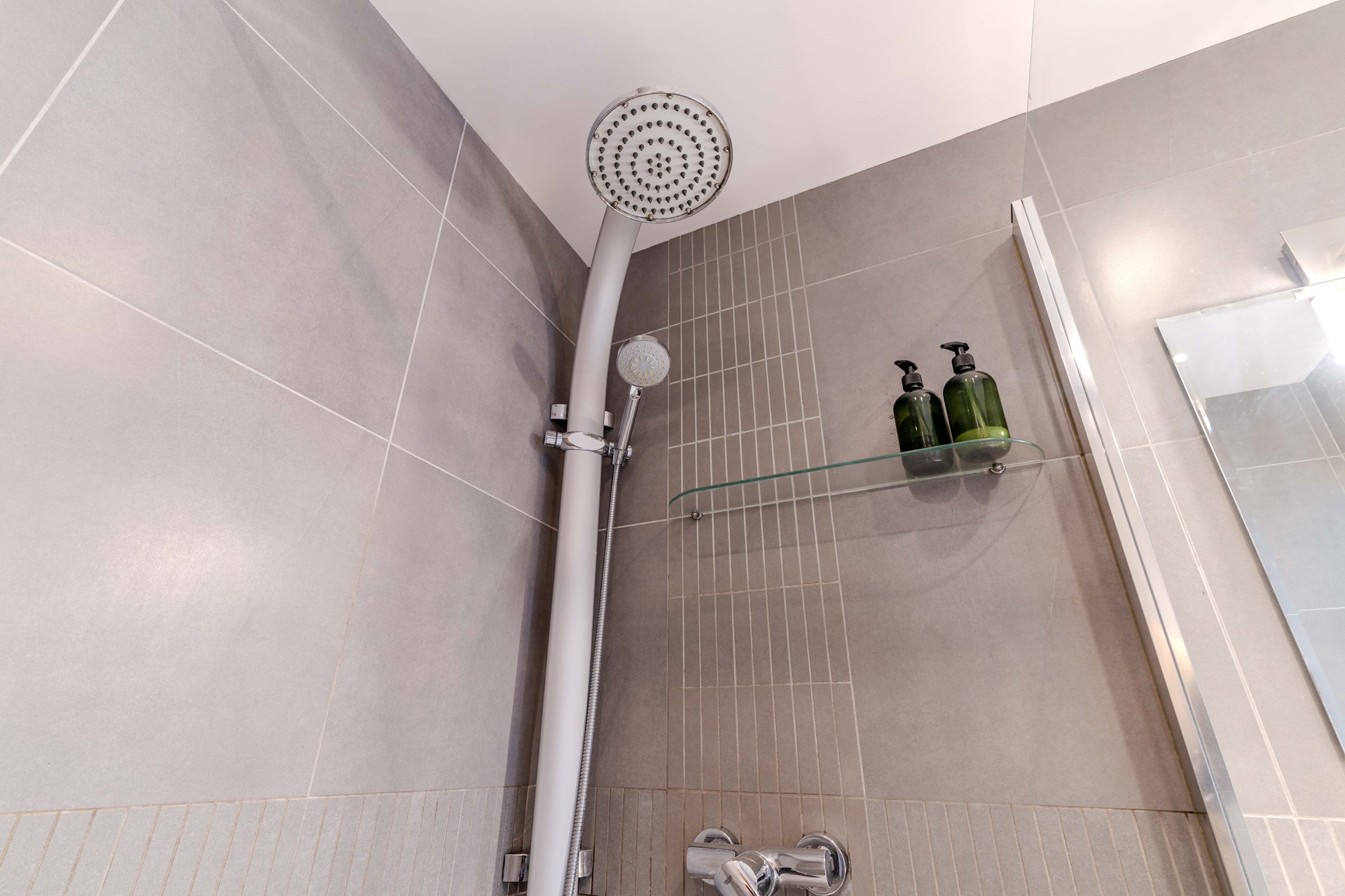 Luxe betegelde badkamer met ruime inloopdouche en een groot wastafelmeubel. Apart toilet bereikbaar vanuit de gang.