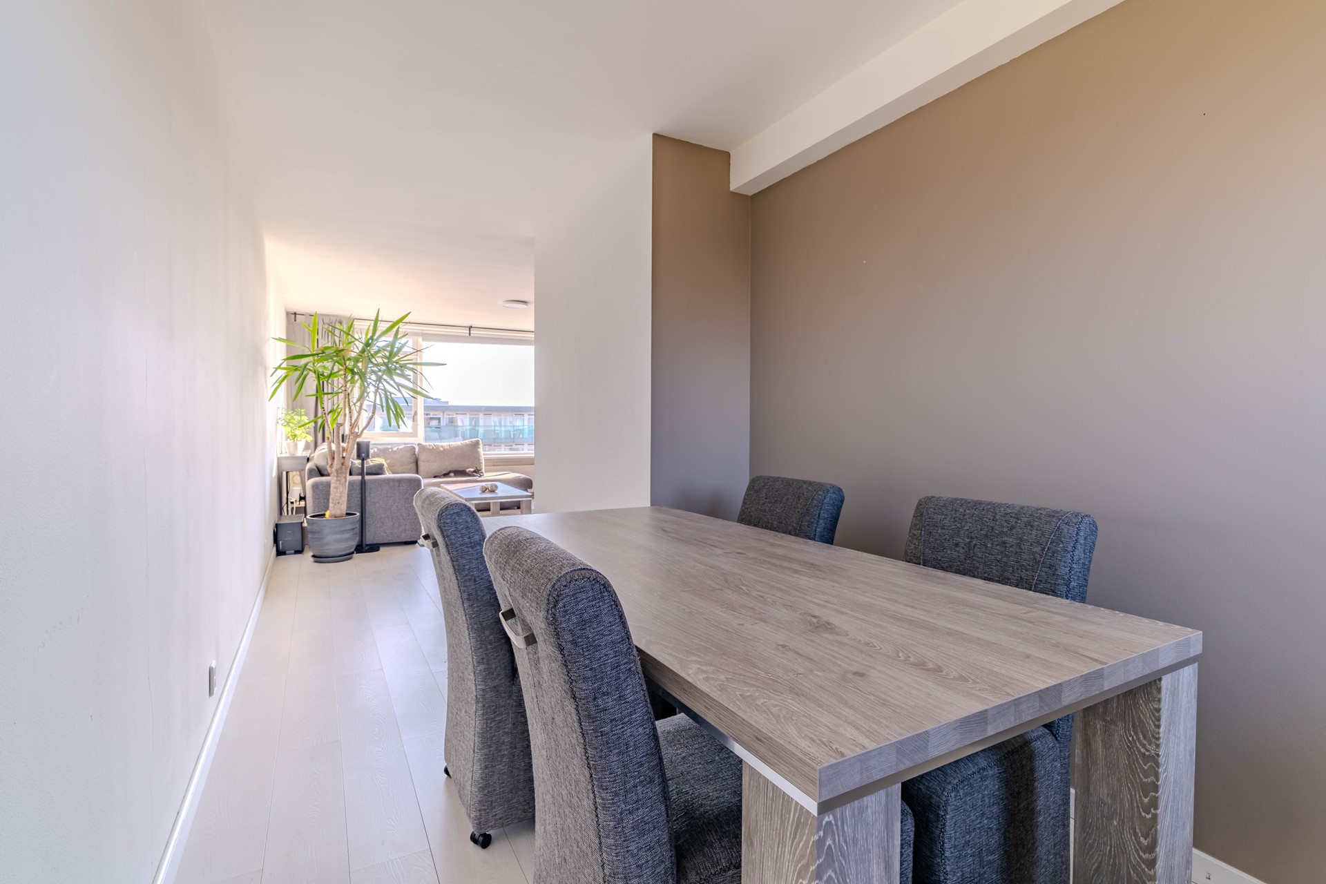 Prachtig uitzicht over het groene park Prinsenhof vanaf de galerij op de zesde verdieping. Achter de voordeur allereerst de vestibule, met daarachter de gang en hal. De woonkamer is groot en super licht door de grote raampartij. Afgewerkt met lichte vloerdelen en mooi gestucte muren. Doorloop naar de eetkamer aan de galerijzijde. Hier is vrij eenvoudig ook een derde slaapkamer te maken indien gewenst.